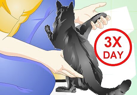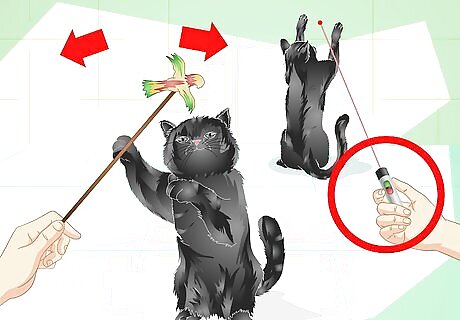Play with your cat multiple times a day. In addition to eating less, your cat will also need to become more active in order to lose weight. Schedule multiple daily playtimes with your cat to get her up and moving. One of those playtimes should be close to her bedtime to tire her out before going to sleep. Since cats like routine, play with her at the same time each day.