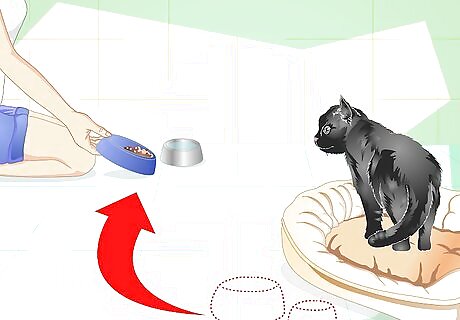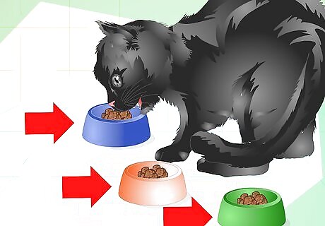 Move her food and water bowls. If your cat is used to walking only a few steps to reach her food and water, move the bowls farther away to increase her physical activity. If you live in a multi-level house, consider moving the bowls to another level to encourage her to walk up and down the stairs. It may take your cat a few days to adjust to the bowls being in a different location.