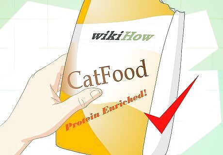 Provide a high-protein diet for your cat. Cats are carnivores, which require protein as the key ingredient in their diet. Your cat’s diet should be at least 35 to 45% protein. Unfortunately, many dry cat foods are low in protein. You may have heard that too much protein in your cat’s diet can lead to kidney problems. Provided your cat is healthy, her body will eliminate the excess protein in her urine and use the rest calories or conversion to fat. Previous studies in rodents suggested a concern for kidney disease with excess protein, but research in dogs and cats has alleviated this concern. Read the food labels to determine if the food has the recommended amount of protein. You should also check the protein source—chicken and lamb are good sources of protein. A good quality food will have these meats, or another form of meat, listed as the first ingredient. Be aware that a cat who overeats on a high-protein diet will still gain weight. To be effective, you must control your pet's portion sizes.
