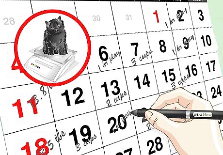 Create a schedule to monitor your cat’s progress. Because you look at your cat every day, it may be difficult for you to see any changes in her weight, whether loss or gain. On a daily basis, record her daily food intake and activity. Weigh your cat once a week and record her weight. Weigh your cat on the same day and at the same time of day. This will give you a more accurate assessment of her weight loss. She probably will not simply step onto the scale herself, so you will need to hold her in your arms when you step on the scale. Weigh yourself first, then weigh yourself with your cat. Subtract your original weight from the ‘you + cat’ weight to get the weight of your cat. Take your cat to your veterinarian every two to four weeks for a more thorough examination. Your veterinarian may recommend adjustments to the weight loss plan.