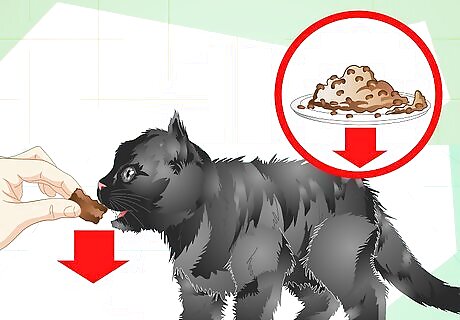 Decrease your cat’s treat and table scraps intake. Your cat probably won’t like it very much, but you will need to cut back on her intake of tasty treats and human food morsels. Cat treats are high in carbohydrates, and are purposely made to be so scrumptious that your cat will want to eat them even when she’s not hungry. If your cat has gotten used to getting treats if she howls enough, you will need to break her of this habit. You should not reward her with treats for vocalizing, especially when she needs to lose weight. Tasty table scraps are often high in fat and sugar, and are also off limits. If you cannot resist giving her a little extra food, make it healthy. Examples of healthy treats are broccoli, cooked green beans, and air-popped popcorn (unbuttered and unsalted). Be aware that these treat options may not seem particularly delectable to your cat.