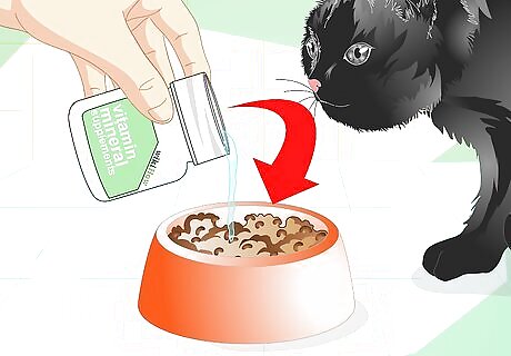 Supplement your cat’s diet. Cutting back on your cat’s food intake means that her diet will have fewer nutrients overall. To compensate, you will need to add various supplements to her diet. For example, your cat will need a vitamin/mineral supplement and a fatty acid supplement. Speak with your veterinarian before adding these supplements to your cat’s diet. Your veterinarian will be able to recommend which supplements to purchase, and how to add them safely to the diet. The fatty acid supplement is needed to keep your cat’s skin and coat healthy. Her coat may become dry and flaky without it. L-carnitine is another nutrient that you can to your cat’s diet. It helps your cat’s body convert fat to glucose and can aid in weight loss. The recommended amount of L-carnitine is 250 to 500 mg per day. Your veterinarian can recommend how much to give your cat.