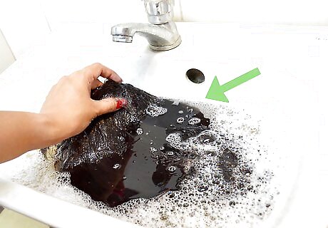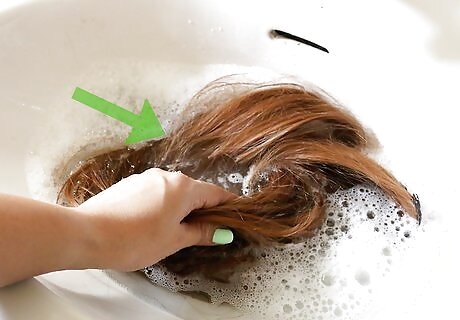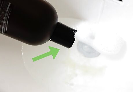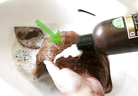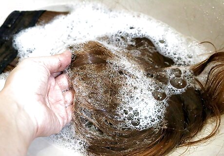 Make a bath for your hair extensions. Put a teaspoon of moisturizing shampoo in about a half cup of lukewarm water and mix them together. When you're finished mixing, fill your sink with warm water and pour in the diluted shampoo. Make sure to use sulfate-free shampoo.