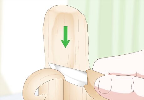 Work in stages to get the basic shape first then refine the shape. Make larger cuts to remove more wood and get the rough shape of your design first. Gradually make smaller and finer cuts as your piece takes shape until you achieve your envisioned design. Once you are happy with the overall shape of your design, you can use the tip of the carving knife to add fine details. For example, if you are carving a person or animal, then you can use the tip of the knife to carve fine lines that look like hair.