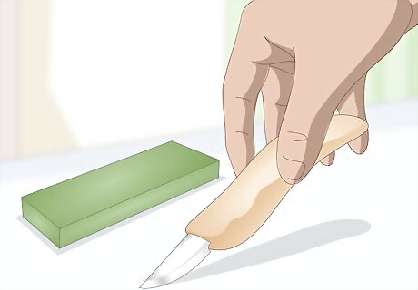 Get a wood carving knife and a ceramic sharpening stone. A purpose-built knife for wood carving with a fixed blade and a long handle is the most comfortable tool to carve wood with. Buy the knife and a ceramic sharpening stone at a woodworking store, craft shop, or order them online. A beginner’s wood carving knife costs as little as $15 USD, and you can get a sharpening stone for less than $10 USD.