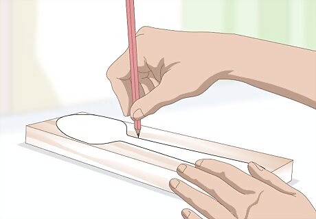 Trace the outline onto your piece of wood with a pencil. Unfold the outline that you cut out and place it flat in the middle, and with the grain, on your piece of wood. Trace all the way around it lightly with a pencil and remove the template. Draw in the shape of the bowl that you will carve out. Try to line up the template with the grain of the wood as straight as possible so that it runs straight through the whole spoon.