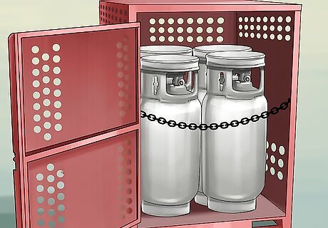 Undo any strapping/gas bottle securing latches and put away the gas bottle. Depending on the forklift model, this may be a simple snap latch system, or it may be a custom built strapping system. Ask for assistance if you are unsure. Similarly on any worksite, you will need to ask your supervisor/other co-worker where the empty forklift's gas bottles are kept. Some workplaces will have a separate cage or area for them; others will have the empty bottles turned upside down with the other bottles.
