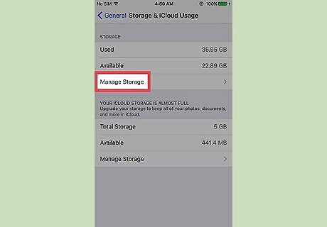 Tap Manage Storage. Once this screen is open, you will see your iPhone's Used and Available storage. There are two places for storage. Tap the button under Storage, not iCloud Storage.