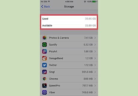 Review your used storage. The storage screen tells you both how much data your phone has available as well as which apps are taking up the most data. The number next to Used tells you how many gigabytes are being utilized on your phone. The number next to Available tells you how many gigabytes you have left. This number is calculated by subtracting your used storage from your available storage. Below your Used and Available storage data, your apps are listed in order of the amount of space they use.