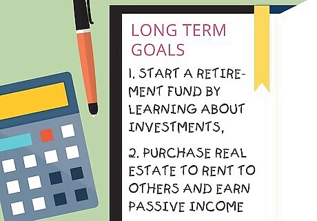 Define your long term financial goals. Long term financial goals include adequately funding retirement or college accounts, purchasing real estate, and making additional investments along the way. Long term goals also need to be defined concretely. How many dollars do you need for an adequate retirement or college fund? Then connect them to your short term goals. How does accomplishing the short term goal allow you to accomplish the long term goal? By making the connection, you'll make it easier for you to realize both long term and short term goals.