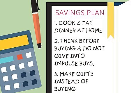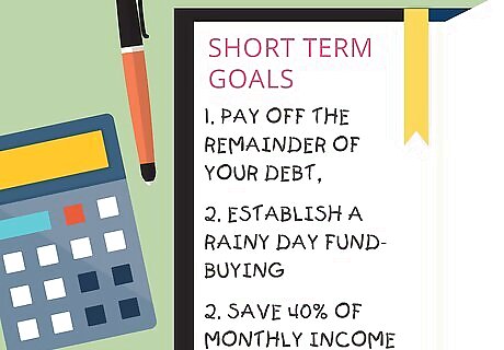 Identify short-term financial goals. It's always easier to save if you have a list of goals that you're saving towards. Identify a set of financial goals for the next twelve months, and tailor your savings plan toward achieving those goals. Short term goals are the easiest to put off, which is why you should make sure you define them concretely. Whether you want to get a new car, pay off the remainder of your debt, or establish a rainy day fund, you need to define how much money it will take to accomplish those goals, and set spending and savings plans at levels that will allow you to accomplish them.