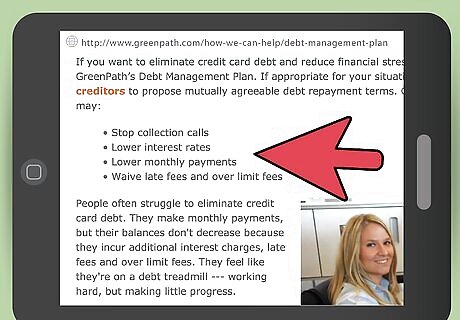 Understand debt consolidation options. Your debt consolidation choices can be divided into two major categories: debt consolidation an debt settlement programs. Debt consolidation through debt management is the best option for most people. The debt management company notifies your creditors and gets debt concessions on your behalf, like waiving late fees. You make one monthly payment to them, and they distribute it to all of your creditors. Debt settlement programs, on the other hand, are usually poor options. They work like this: the debt settlement company takes the money you would be paying your creditors and puts it in an escrow account. They hold it in the escrow account for as long as it takes for the creditor to agree to settle for less than the face value of the debt. Your accounts go delinquent in the meantime.