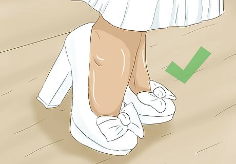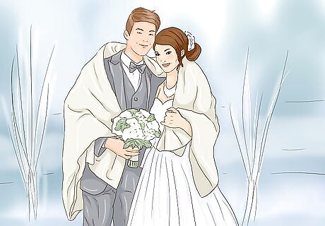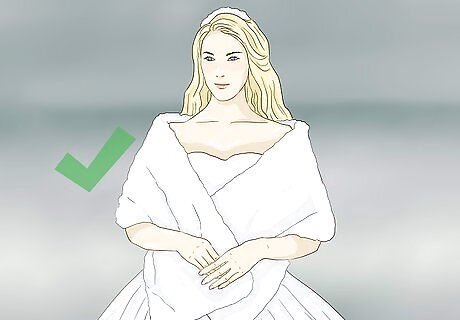 Get elegant outerwear to wear outdoors. You probably don’t want to pop your puffy winter coat over your beautiful wedding dress. For your winter wedding, it’s a great idea to invest in some appropriate outwear. A faux fur stole is a great option, as well as a cashmere shawl in your wedding color. This will look sophisticated and glamorous in pictures, and you’ll be warm. Win, win! You can shop for faux fur stoles online, or check out your local department stores. The bridal shop where you purchased your dress might be able to point you in the right direction. Bring a swatch of your wedding colors to a department store if you're searching for a cashmere wrap or shawl. This will ensure your colors don't clash on the big day.