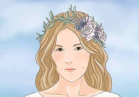 Experiment with winter-themed flower crowns. When you hear the phrase “flower crown,” you probably picture the bright, colorful flower crowns worn by spring and summer brides. However, winter brides can wear their own version of the popular accessory. Instead of colorful flowers, look for (or craft) a rich evergreen crown. Then, you can add whatever flowers you are using for the rest of the festivities. You want your winter wedding flower crown to look more like a Christmas wreath than a spring bouquet. Choose a crown with more greenery than flowers. The deeper the green, the better. More muted flowers work beautifully in the winter, as well as metallic detailing.