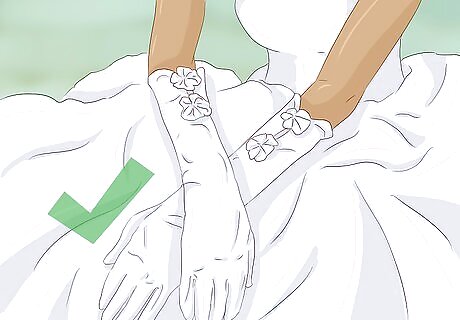 Buy some nice gloves. You may not be planning to be outside much on your wedding day, but you’ll likely get at least a few photos outside. Keep your hands warm (and reduce the risk of blue hands ruining your photos) by investing in a nice pair of gloves. You can easily find these online, and you can order them to match your wedding dress or accessories. You can even find an ultra glamorous pair with beading or silk ribbons!