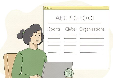 Find out what activities are available. Search your school’s website for a complete list of all the sports, clubs, and organizations that it provides. Also look for calendar details, such as start- and end-dates, plus event schedules, to make sure it won't get in the way of anything else going on in your life. If the website seems incomplete, talk with your guidance counselor or adviser. Also look for other organizations in your community, such as: Local churches and volunteer centers, like food banks or the Red Cross. Private clubs, lessons, and organizations, like the YMCA or the Boy & Girl Scouts. Recreational centers run by your town. Job opportunities.