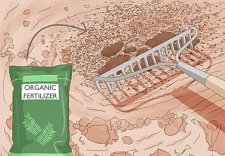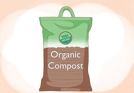 Enrich your soil with organic compost. Compost encourages healthy microbial activity in your soil and offers nutrients to your plants. When done properly, composting can destroy weed seeds in manure and other organic fertilizers. You can make your own compost in your yard from kitchen scraps, or buy organic compost from a garden center or organic farm in your area. If you buy compost, avoid anything containing “biosolids,” which may include human waste and synthetic chemical pollutants. If you choose to make your own compost, include things like fruit and vegetable scraps, healthy lawn clippings, eggshells, and sawdust from untreated wood. If you want to reduce the potential concentrations of pesticides or other unwanted compounds as much as possible, only use organic food scraps in your compost. Do not attempt to compost with meat, fat, dairy products, leaves or wood from diseased plants, sawdust or wood chips from treated wood, or pet waste.