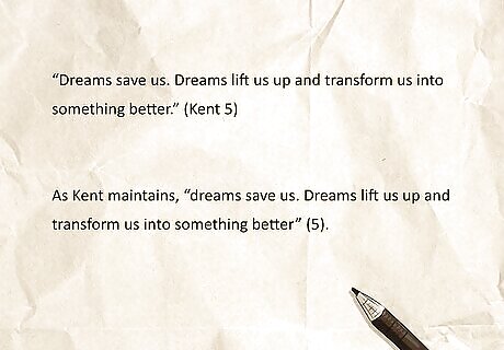 MLA in-text citation There are two types of in-text citations for textbooks in MLA: parenthetical citations and narrative citations. A parenthetical citation appears in parentheses after the text that quotes or cites the source, and it follows this format: (Author's Last Name Page #). A narrative citation incorporates the author’s name into the sentence that quotes or cites them with the page number at the end of the sentence, e.g., “Author’s Name argues that… (Page Number).” Sample MLA in-text citation (parenthetical): “Dreams save us. Dreams lift us up and transform us into something better.” (Kent 5) Sample MLA in-text citation (narrative): As Kent maintains, “dreams save us. Dreams lift us up and transform us into something better” (5). If the textbook has two authors, include both authors’ last names separated by “and.” If there are three or more authors, write the first author’s last name followed by “et al.”.