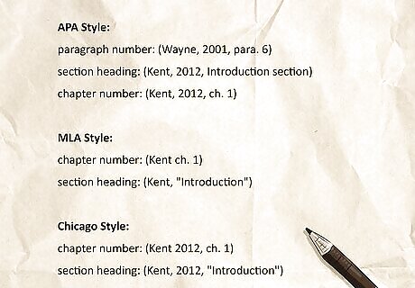How do I cite a source with no page numbers? If the textbook passage that you want to cite doesn’t have a page number, then use an alternate locator for your in-text citation. Nearly all of the citation styles accept a header or chapter number in place of a page number, e.g., (Kent, 2012, ch. 1). If you’re using APA, you can also count the paragraphs and include the paragraph number in your citation: e.g., (Wayne, 2001, para. 6). MLA and Chicago style, however, only recommend this alternative if the paragraph numbers are marked in the text.