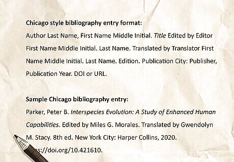 Chicago style bibliography entry A Chicago style book or textbook citation includes the author’s name, the textbook title italicized and capitalized in title case, the editor’s name (if applicable), the translator’s name (if applicable), the edition (if specified), the city of publication, the publisher, the year of publication, and the DOI or URL. Chicago style bibliography entry format:Author Last Name, First Name Middle Initial. Title Edited by Editor First Name Middle Initial. Last Name. Translated by Translator First Name Middle Initial. Last Name. Edition. Publication City: Publisher, Publication Year. DOI or URL. Sample Chicago bibliography entry:Parker, Peter B. Interspecies Evolution: A Study of Enhanced Human Capabilities. Edited by Miles G. Morales. Translated by Gwendolyn M. Stacy. 8th ed. New York City: Harper Collins, 2020. https://doi.org/10.421610. If you’d like to cite a specific chapter of a textbook, put the chapter title in quotations after the author’s name. End the chapter title with a period, then write “In” before the book title. For example: Parker, Peter B. “The Physics of Web-Swinging.” In Interspecies Evolution: A Study of Enhanced Human Capabilities. Edited by Miles G. Morales. Translated by Gwendolyn M. Stacy. 8th ed. New York City: Harper Collins, 2020. https://doi.org/10.421610.