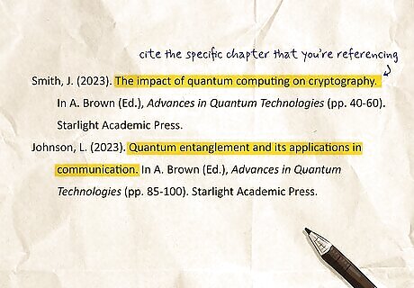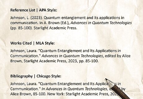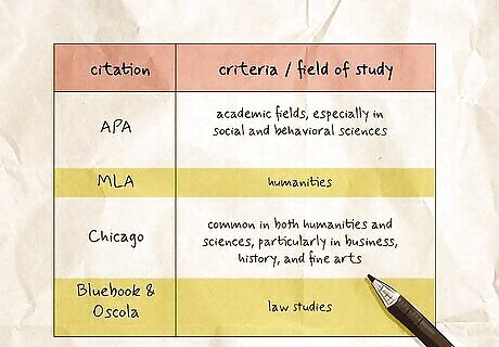 Choose your citation style based on your paper criteria or field of study. If you’re writing a paper or essay for a class or university course, your teacher or professor will likely tell you which citation style to use. If they haven’t given you this instruction, you may want to ask them if they have a preference. Otherwise, you can choose from one of the citation styles used in your field of study or research: APA Style: The most popular style in academic fields, especially in social and behavioral sciences. MLA Style: The second-most popular style, widely used in the humanities. Chicago Style: Common in both humanities and sciences, particularly in business, history, and fine arts. Bluebook & Oscola: Typically reserved for law studies. Other specialized styles exist for specific disciplines, so research your academic area for more detailed information.