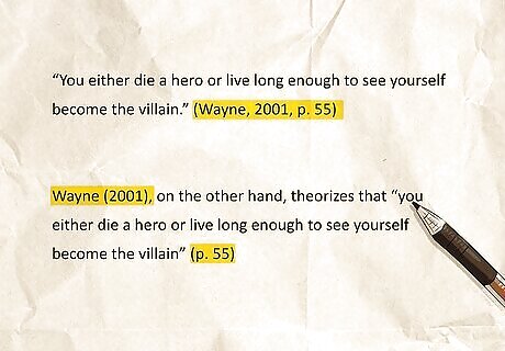 APA in-text citation When quoting a textbook in APA style, there are two types of in-text citations: parenthetical and narrative. For a parenthetical citation, write the author’s last name with the year of publication and page number(s) in parentheses after the text that directly quotes the source (e.g., (Author's Last Name, Year, Page #)). For a narrative citation, write the author’s name into the sentence and add the year of publication and page number(s) in parentheses. Sample APA in-text citation (parenthetical): “You either die a hero or live long enough to see yourself become the villain.” (Wayne, 2001, p. 55) Sample APA in-text citation (narrative): Wayne (2001), on the other hand, theorizes that “you either die a hero or live long enough to see yourself become the villain” (p. 55) If the textbook has two authors, write both authors’ last names separated by an ampersand. If the textbook has three or more authors, write the first author’s last name followed by “et al.”.