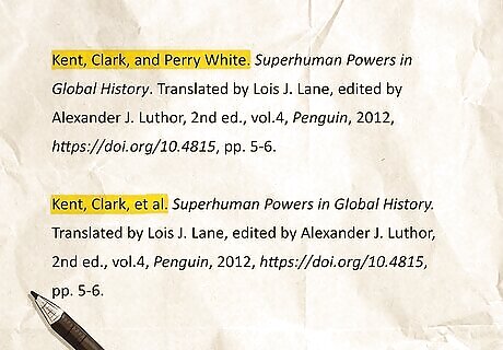 If there are multiple authors of a textbook… If a textbook has two authors, write the Works Cited entry with their names listed in the order that they appear on the work. Invert the first author’s name (e.g., “Kent, Clark”) but write the other name normally (e.g., Perry White). If a textbook has three or more authors, invert the first author’s name, add a comma, then write “et al.”. Sample Works Cited entry with 2 authors: Kent, Clark, and Perry White. Superhuman Powers in Global History. Translated by Lois J. Lane, edited by Alexander J. Luthor, 2nd ed., vol.4, Penguin, 2012, https://doi.org/10.4815, pp. 5-6. Sample Works Cited entry with 3 authors: Kent, Clark, et al. Superhuman Powers in Global History. Translated by Lois J. Lane, edited by Alexander J. Luthor, 2nd ed., vol.4, Penguin, 2012, https://doi.org/10.4815, pp. 5-6. If citing a textbook with no clear author, omit the author’s name from the format and start the citation with the title of the work. For the in-text citation, use a shortened title of the work in parentheses (i.e., the first 1-3 words).