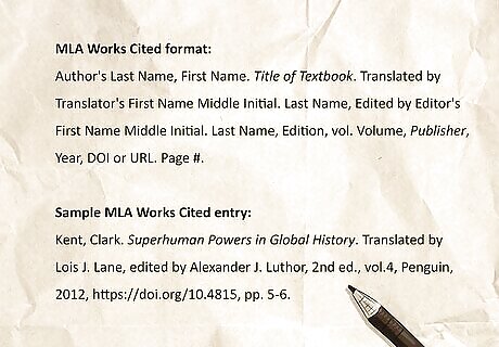 MLA Works Cited entry An MLA book or textbook citation includes the author’s name, the textbook title italicized and capitalized like a headline, the translator’s name (if applicable), the editor’s name, the edition (if specified), the volume number (if specified), the publisher (in italics), the year of publication, the DOI or URL, and the cited page number range. MLA Works Cited format:Author's Last Name, First Name. Title of Textbook. Translated by Translator's First Name Middle Initial. Last Name, Edited by Editor's First Name Middle Initial. Last Name, Edition, vol. Volume, Publisher, Year, DOI or URL. Page #. Sample MLA Works Cited entry:Kent, Clark. Superhuman Powers in Global History. Translated by Lois J. Lane, edited by Alexander J. Luthor, 2nd ed., vol.4, Penguin, 2012, https://doi.org/10.4815, pp. 5-6. If you’d like to cite a specific chapter of a textbook, put the chapter title in quotation marks between the author’s name and the title of the textbook. For example: Kent, Clark. “Heat Vision: A Burning Intensity.” Superhuman Powers in Global History. Translated by Lois J. Lane, edited by Alexander J. Luthor, 2nd ed., vol.4, Penguin, 2012, https://doi.org/10.4815, p. 20.
