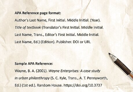 APA Reference Page entry An APA book or textbook citation includes the: author’s name, the year of publication, the textbook title (italicized and in sentence case), the translator’s name (if applicable), the edition, the publisher, and the DOI or URL. APA Reference page format:Author's Last Name, First Initial. Middle Initial. (Year). Title of textbook (Translator's First Initial. Middle Initial. Last Name, Trans., Editor’s First Initial. Middle Initial. Last Name, Ed.) (Edition). Publisher. DOI or URL Sample APA Reference:Wayne, B. A. (2001). Wayne Enterprises: A case study in urban philanthropy (S. C. Kyle, Trans., A. T. Pennyworth, Ed.) (1st ed.). Random House. https://doi.org/10.3737 If you’d like to cite a specific chapter of a textbook, write the chapter title in sentence case immediately after the author name. For example: Wayne, B. A. (2001). Vigilantism and crisis mitigation. Wayne Enterprises: A case study in urban philanthropy (S. C. Kyle, Trans., A. T. Pennyworth, Ed.) (1st ed.). Random House. https://doi.org/10.3737