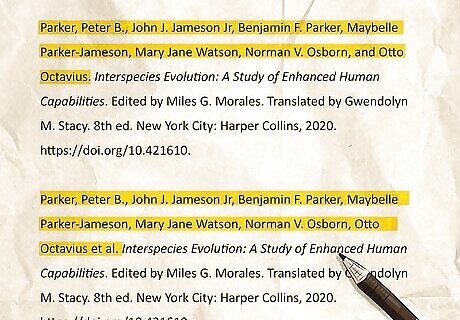 If there are multiple authors of a textbook… If a textbook has multiple authors, cite up to 10 in the reference entry for a bibliography. List the authors’ names, but only invert the name of the first author. If the textbook has more than 10 authors, only list the first seven names, followed by “et al.”. Sample bibliography entry with 7 authors: Parker, Peter B., John J. Jameson Jr, Benjamin F. Parker, Maybelle Parker-Jameson, Mary Jane Watson, Norman V. Osborn, and Otto Octavius. Interspecies Evolution: A Study of Enhanced Human Capabilities. Edited by Miles G. Morales. Translated by Gwendolyn M. Stacy. 8th ed. New York City: Harper Collins, 2020. https://doi.org/10.421610. Sample bibliography entry with 11 authors: Parker, Peter B., John J. Jameson Jr, Benjamin F. Parker, Maybelle Parker-Jameson, Mary Jane Watson, Norman V. Osborn, Otto Octavius et al. Interspecies Evolution: A Study of Enhanced Human Capabilities. Edited by Miles G. Morales. Translated by Gwendolyn M. Stacy. 8th ed. New York City: Harper Collins, 2020. https://doi.org/10.421610. If citing a textbook with no clear author, start the citation with the title of the work.