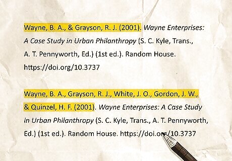 If there are multiple authors of a textbook… If a textbook has two or more authors, include both authors in the reference entry. All authors’ names can be written as Last Name, First Initial. Middle Initial. Just separate each name with a comma and place an ampersand (&) before the final author. If a work has 20 or more authors, include the first 19 authors’ names, then insert an ellipsis (...) before the final author’s name. Sample Reference page entry with 2 authors: Wayne, B. A., & Grayson, R. J. (2001). Wayne Enterprises: A Case Study in Urban Philanthropy (S. C. Kyle, Trans., A. T. Pennyworth, Ed.) (1st ed.). Random House. https://doi.org/10.3737 Sample Reference page entry with 5 authors: Wayne, B. A., Grayson, R. J., White, J. O., Gordon, J. W., & Quinzel, H. F. (2001). Wayne Enterprises: A Case Study in Urban Philanthropy (S. C. Kyle, Trans., A. T. Pennyworth, Ed.) (1st ed.). Random House. https://doi.org/10.3737 If citing a textbook with no clear author, begin the reference entry with the book title followed by the year of publication in parentheses. For in-text citations, use the title of the book instead of the author's name.
