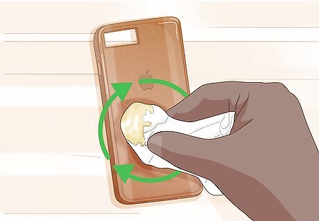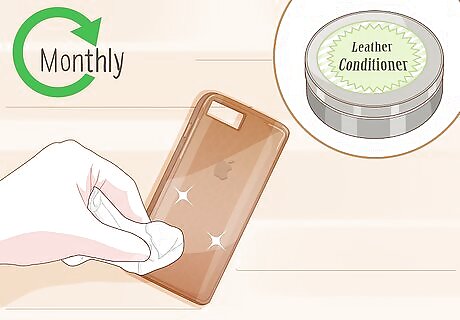 Use leather conditioner monthly preserve your phone case. Use these products at least once a month to keep your iPhone case looking supple. Make sure to apply a thin layer of whichever type of conditioner you choose. You can pick up leather conditioner at chain retailers or your local hardware store. You can also order the conditioner online. Over-applying conditioner can darken lightly-colored leather. Conditioners also help with scratches on your iPhone case. Although you cannot remove a scratch, covering it with the conditioner will make the scratch less obvious and keep the leather healthy. You can use mink oil instead of leather conditioner.