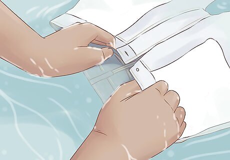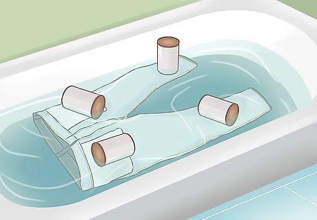 Soak the raw denim in cold water. Every time you wash your raw denim, turn them inside out. This helps reduce the color bleeding. Cover the denim completely in cold to lukewarm water. If the jeans float and won’t submerge completely under water, use something to hold them down in the water.
