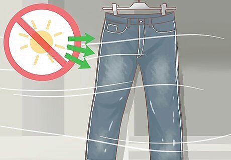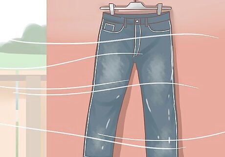 Let the denim air dry. After the cycle ends, turn them right side out. Place the denim on a surface where they can drip and air dry. Place something like a bucket under the denim to catch the water, or place them outdoors. Make sure they are not in direct sunlight. This may cause fading. Leave them until they are completely dry. If you decide to wring the water out, do it gently. Wringing too hard can damage the denim. Lay the denim flat afterwards so it doesn't wrinkle.