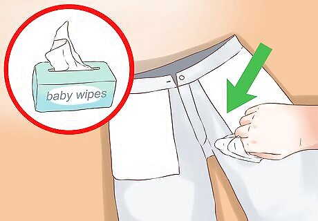 Try a baby wipe. A baby cleaning wipe may also help remove odors and bacteria. Baby wipes have antiseptic qualities, so wipe along areas that may hold bacteria or where you have sweated. The wipes can remove stains or spills on the denim. You can get unscented baby wipes, so if you don’t want to smell like lavender or tea tree oil, this may be a better option.