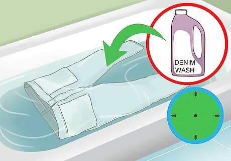 Soak with a denim wash for an hour. Use a specific denim wash detergent to clean the denim. This product will be gentle on your raw denim and not mess it up. Let the denim soak in the detergent and water for at least an hour. You may want to dunk the jeans a few times or move the water around. If you don’t have denim wash, you can use a color protecting gentle detergent.