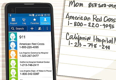 Keep digital and written lists of important phone numbers. During a hurricane, you won't have a lot of time to look up individual phone numbers. Therefore, put any numbers you know you'll need into your phone beforehand. Keep a written list of important numbers as well in case your phone runs out of power or breaks during the storm. To make communication as quick and easy as possible, adjust your phone's speed dial settings so each number connects to an important contact. If possible, laminate your written list so it doesn't get destroyed by rain or floodwater.