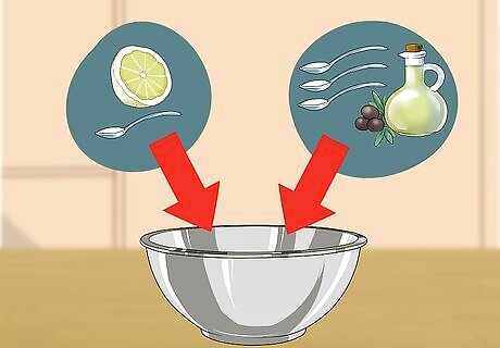 Place the following ingredients into a microwave bowl: 1 tablespoon of lemon juice 2-3 tablespoons of olive oil.