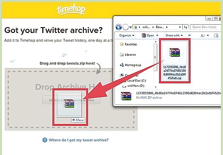 Drag and drop the Twitter Archive zip file to Timehop. Now open a file explorer on your computer, and go to where the downloaded Twitter Archive zip file was saved. Click and hold the file. Drag it and drop it in the box in the Timehop page. Alternatively, you can click the “Upload your tweets.zip archive” button inside the box, then browse for the download zipped file on your computer. Select the file and click “Open.”