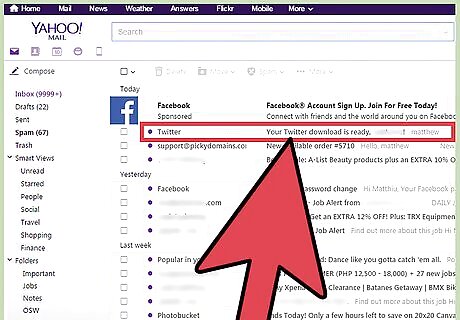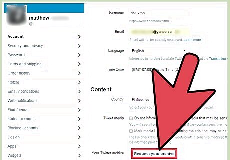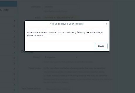 Request your Archive. While on the Twitter Settings page, scroll to the bottom of the page and click the “Request your Archive” button. When you click this button, a pop-up message will come informing you that your archive link will be sent to your email.
