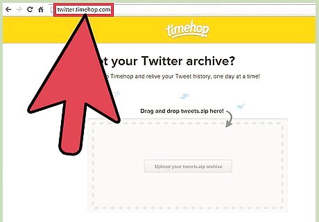 Visit the Timehop website. On a new tab in your browser, go to the Twitter Timehop website. This will direct you to the Timehop page for importing Twitter Archive. In the middle of this page is a big box with an “Upload your tweets.zip archive” button inside.