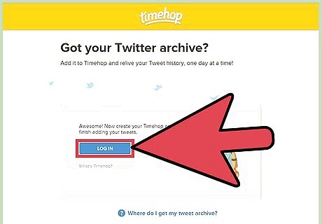 Log into your Timehop account. When the upload of the file is complete, Timehop will ask you to log into Timehop to finish adding the Twitter Archive. Click the “Log in” button on the message that appears. This will take you to a screen for logging in using your X account details. Enter your X username on the first box and password on the second box. Then click “Sign in” underneath to log into Timehop. The process of connecting the Twitter Archive will be complete after logging into Timehop. You will now be receiving daily notifications in your email and on your phone of what you tweeted today, one year ago. On phone, the notification is through the Timehop application.