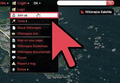 Go to Wikimapia and look at the screen. At about the top center, you will see the word Login. Click on it.