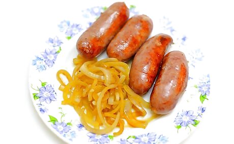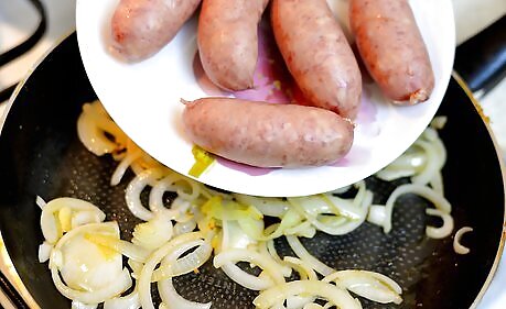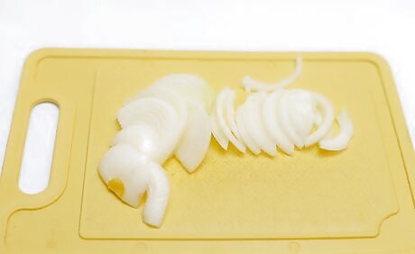 Chop 1 onion. Use 1 medium-sized white, yellow or sweet onion. Chop the onion into rings. These will cook with the bratwurst, giving a nice flavor and companion to the sausage.