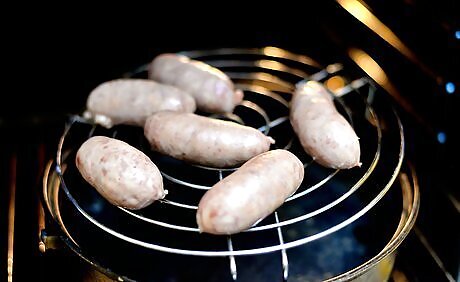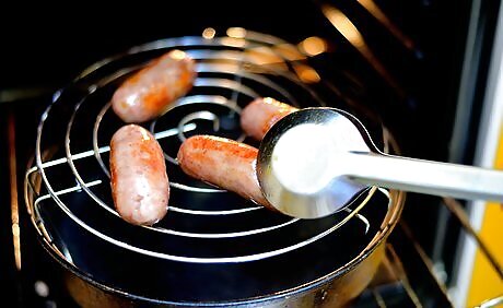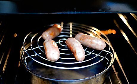Put brats on a broiler pan. Make sure there is a little room around each brat. Line them up to be perpendicular to the grates on the broiler pan. You can also use a cast-iron skillet instead of a broiler pan. Be sure to rotate the brats every 5 minutes to prevent them burning on one side.