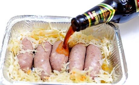 Use a disposable aluminum pan to poach bratwurst first. Use the heat of the grill to poach the bratwurst before putting them directly on the grill. Get a disposable aluminum pan at the grocery store. Put your bratwurst in these, along with some chopped onion, red or green peppers, or other vegetables. You can also put a bed of sauerkraut in the bottom of the aluminum pan. Pour some beer over the brats (about 6 ounces) and let this simmer with the grill lid down for about 15 minutes. Check the internal temperature of the brats with a meat thermometer. They should be about 160 °F (71 °C). Remove the brats and place them directly on the grill for about 5-7 minutes. Be sure to turn them over about halfway through the grilling time.