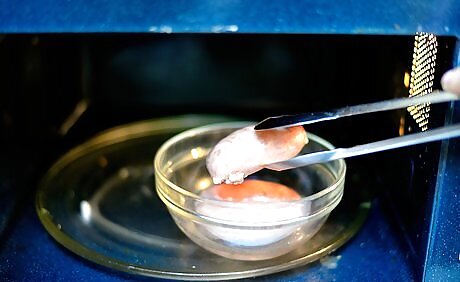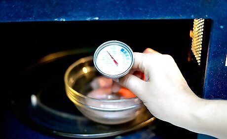 Check the bratwursts to see if they’re done. Use a meat thermometer and poke into one bratwurst so that the tip of the thermometer rests in the middle of the bratwurst. It should reach 160 °F (71 °C). Alternately, you can cut into the bratwurst with a knife to check if it’s done. If it is still pink, put it back in the microwave for one more minute on a high setting.