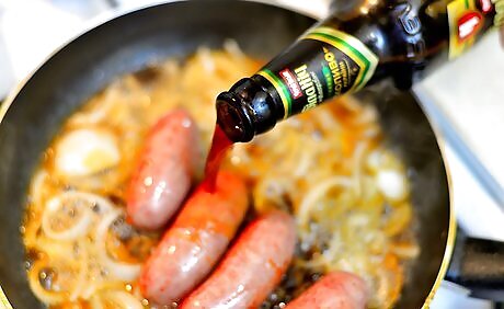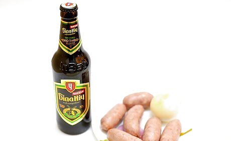 Assemble your ingredients. In order to poach bratwurst in beer, you will need to assemble your ingredients and have everything on hand before you start. You will need: Bratwurst: use as many as will fit into your pan or as many as you plan to serve One medium-sized white, yellow or sweet onion 6 ounces of dark beer