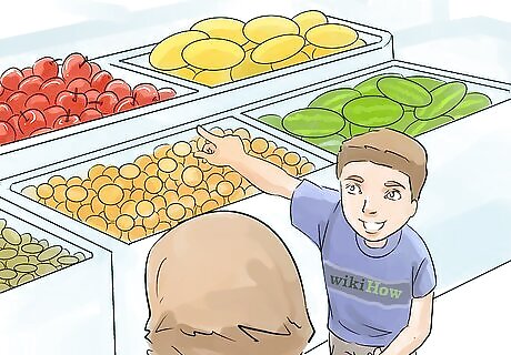 Let your kids pick out a new fruit or vegetable when you go shopping. You can tap into your kids’ natural curiosity by inviting them to find a new fruit or veggie in the produce department each time you visit the store and then prepare that for them as part of a meal. This can be a fun way to get your kids to try new things and keep them entertained for a few minutes in the grocery store! For example, if your child chooses rhubarb, you could make a rhubarb pie with them. If your child chooses oyster mushrooms, you could add them into a vegetable stir-fry. If they choose apple, then you can try making homemade jello for them with apples. Keep in mind that your kids may search out the strangest looking item they can find, but this is a good thing! Encourage their adventurous nature by showing excitement about what they picked, even if you are not quite sure what it is.