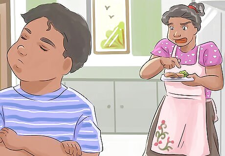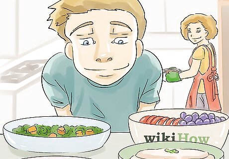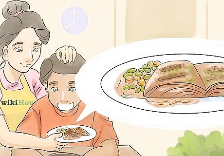 Work some new foods into the recipes you choose. Whether you are making an old favorite for your kids or trying out something totally different. Make sure to work some new foods into your kids’ meals, even if you are just adding a new vegetable as a side dish. Make sure to offer new foods when your child is relaxed and in a good mood. Avoid offering a new food when your child is very hungry. Act casual and model for your kids when you offer the new food. Try the food, offer some to your kids, and say something like, “Mmm. This garlicky broccoli is fantastic!”